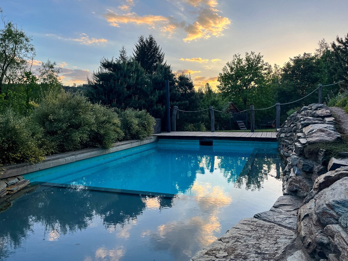 Jöjjön el a nyüzsgő életből a Podkrkonoší szívében található házunkba. Minden kényelem, a meleg víztől a légkondicionálásig, magától értetődő. Az üvegezett terasz lehetővé teszi, hogy a belső tér kényelméből élvezze a környező természet szépségét. Itt élvezheti a reggeli kávét vagy egy romantikus vacsorát. Teljesen felszerelt konyha és szabadtéri grill is rendelkezésre áll. És a wellness? Szabadtéri egész évben pezsgőfürdőnkben a szabad ég alatt elfelejtheti minden gondját!