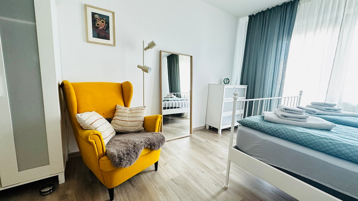 A hangulatos, kétszobás lakás a Kohlbruck kerületben található. Sétatávolságra különböző vásárlási lehetőségek (Aldi, Kaufland stb.), bankok, benzinkutak, éttermek, kiállítási területek, kalandmedence, rendőrség, játszótér stb. Ha nem félsz egy hosszabb sétától, jó 30 perc alatt elérheted a központot. Ellenkező esetben a 8-as busz közvetlenül a bejárati ajtó előtt áll meg, az 1-es és 2-es pedig körülbelül 100 méteren keresztül. Egyszerű és gyors összeköttetés az autópályával. Rendelkezésre álló parkolóhely.