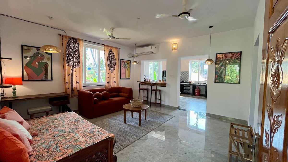 Üdvözöl a Luna 🌙 Ahol a napok lágyabbnak tűnnek, és az esték egy kicsit tovább ragyognak Dél-Goában ✨🌴 Privát 2BHK a Varca Beach közelében, mindössze 650 m sétára a nyugodt homoktól 🏖️ Bohó stílusú melegség 🌾, holdfényes tónusok, és a Casa Regal kényelmébe burkolózva, a Luna🌙 a lassú reggelekre, hangulatos sarkokra és a sietség nélküli, csillagok alatti szállásokra készült ✨