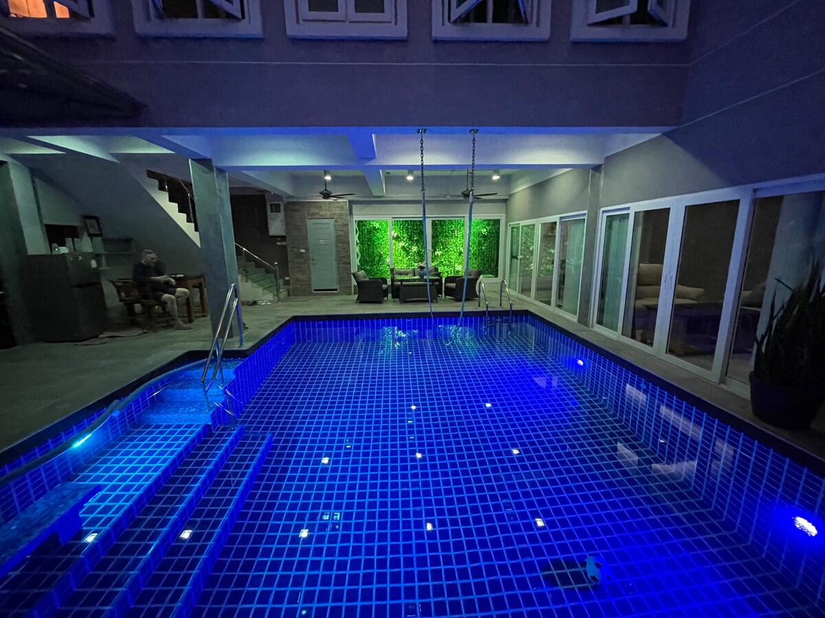 🏡 Natcha Pool Villa bemutatása ✨ Tágas Kétszintes villa, 5 hálószoba, 6 fürdőszoba, kb. 350 négyzetméteres beépített terület, észszerű elrendezés, kényelmes és lakható. 🏋️ Privát edzőterem A villa saját edzőteremmel rendelkezik, amely segít az egészséges életmód fenntartásában a nyaralás során. 🏊 Luxusmedence Nagy privát medence, tágas és tiszta, ideális a szórakozáshoz a családdal és a barátokkal. 🌆 Kiváló elhelyezkedés Pattaya város közelében, sétatávolságra a 7-11-től, Big C szupermarket, a híres Hollywood szórakozóhely mellett, kényelmes a lakás és szórakozás. 🎨 Modern A villa belseje modern és fényűző stílusban van berendezve, gondosan kiválasztott bútorokkal és puha ágyneművel, ami kiemeli az elegáns ízlést. 🔒 Biztonság A villa egy csúcskategóriás környéken található, 24 órás biztonsági szolgálattal, amely biztosítja a magánszférát és a biztonságot. 🌿 Csendes környezet A nyüzsgéstől távol, a környezet csendes és privát, így ideális választás egy pihentető nyaraláshoz.