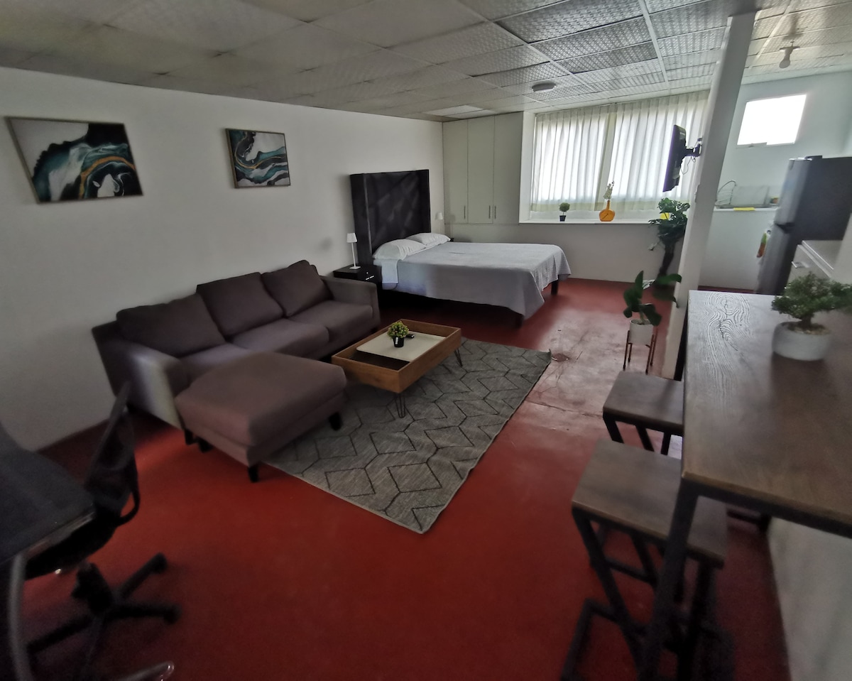 Disfruta de una experiencia con estilo en este alojamiento céntrico. Moderno estudio diseñado para ofrecer comodidad y estilo en un espacio compacto pero completamente funcional. Perfecto para viajeros de negocios, parejas o aquellos que buscan una escapada tranquila. Cuenta con Wi-Fi de alta velocidad, TV streaming (prime Netflix) toallas y ropa de cama incluidas, además de una cocina completamente equipada con todo lo necesario para preparar tus comidas. PH, jabón, champú cortesía.