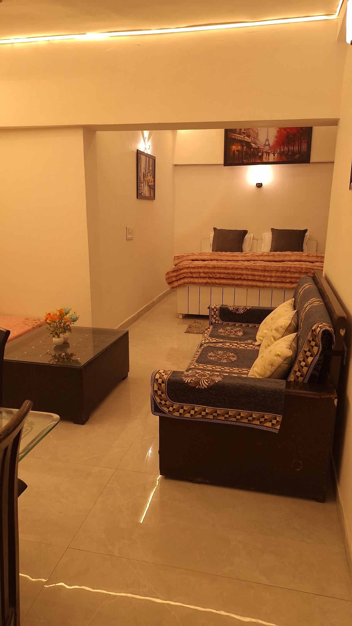 Stylish Comfort in the Heart of Rajnagar Extension A cozy, modern stay in the center of Rajnagar Extension. Enjoy easy access to shops, cafes, salons, groceries, and local food stalls — all just steps away. The fully furnished flat offers elegant decor, soft lights, and comfy furniture. Ideal for work trips, family visits, or city breaks. Feel right at home in a safe, walkable, and vibrant area with everything you need nearby.