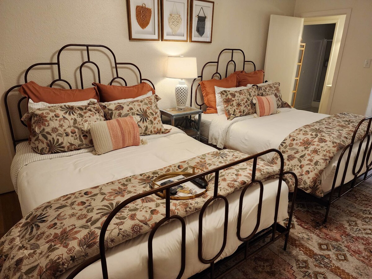 A 4. szobában ropogós, piros kockás színű színösszeállítás és vintage bútorok találhatók, így ez a legkisebb szobánk, otthonosnak és őszintén szólva az egyik kedvencünk. A queen méretű ágy, a privát fürdőszoba, valamint az 1950-es évek széke és lámpája kényelmes kilátást biztosít a hegyre, és kényelmes hozzáférést biztosít az oldalsó bejárathoz. A főutcától mindössze 3 háztömbnyire található Inn egyedülállóan otthonos hangulatot áraszt. Minden helyiségből ki lehet jutni a konyhába, a nappaliba, az étkezőbe 8 férőhelyes asztallal és a napozószobába.