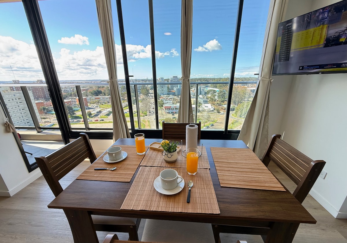 It's modern, luminous and remade like new. Has a gorgeous view from the balcony, where sunsets are beautiful. It's 2-5 blocks away from the Mansa and Brava beaches, port, bars, restaurants, stores and supermarkets. Security and front desk 24hs, covered parking, housekeeping service, laundry room, small gym and game room. For Holiday season five nights minimum stay.