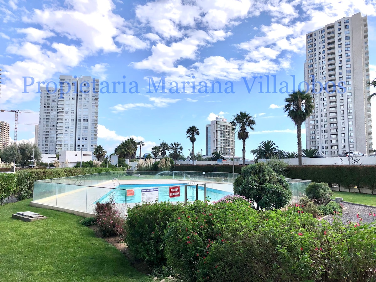 Ralájate en este hermoso departamento completamente equipado. * Wifi rápido * Calefacción * Secador de pelo * Plancha * Ropa de cama * Tostadora electrica * Material de lectura *Juegos de mesa * Mallas de seguridad en todo el lugar Disfruta de una soleada piscina con áreas verdes, zona de juegos, quinchos, sala multiuso, estacionamiento, acceso controlado las 24 hrs. y acceso a pie a las mejores playas de la ciudad.