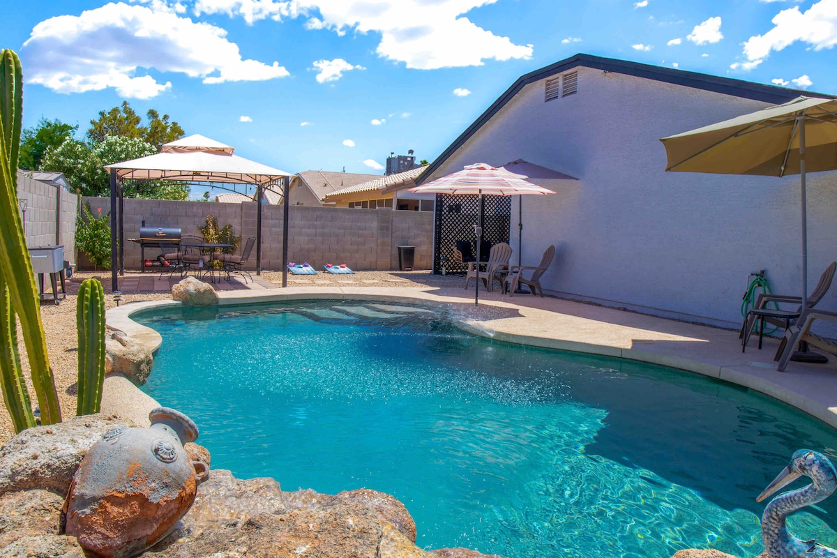 Üdv a stílusos sivatagi üdülőhelyeden! Ez a nemrégiben felújított, két hálószobás otthon tökéletes egyensúlyt kínál a kényelemesség, a kényelem és a báj között. Peoria szívében található, így csak pár percre vagy a vásárlási lehetőségektől, éttermektől, szórakozási lehetőségektől és a tavaszi edzésre használt baseballstadionoktól, így rövid kiruccanásokhoz és hosszabb távú foglalásokhoz is tökéletes hely. Élvezd a nyugodt környezetet és a modern kényelmi szolgáltatásokat, amelyek igazán különlegessé teszik ezt a szállást.