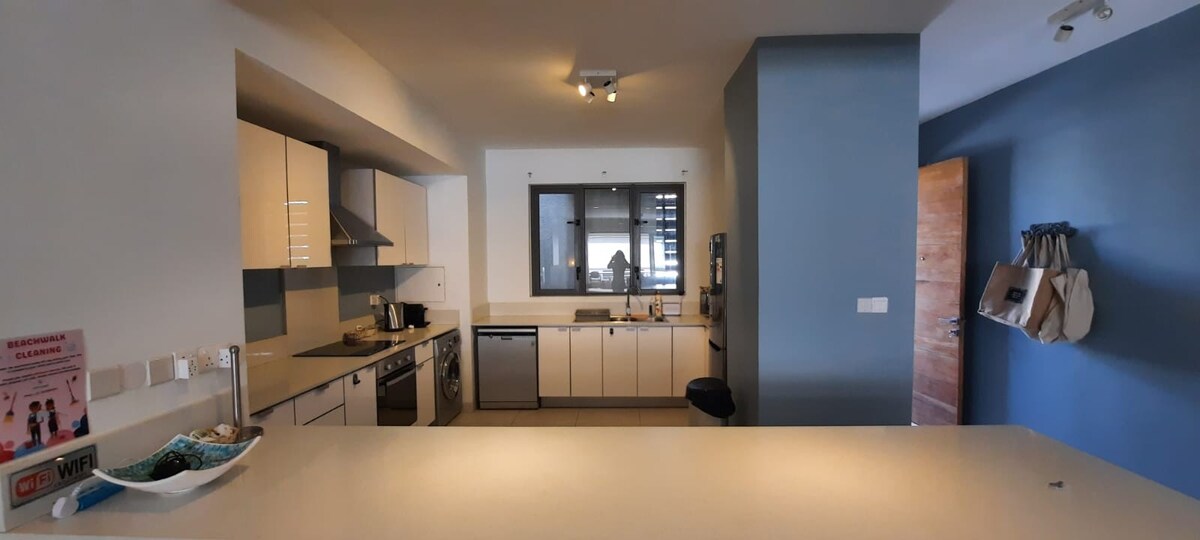 A Bain Boeuf stranddal szemben, csendes és hűvös sávban található Beachwalk tágas (170 m2), modern és világos. A nappali és a fő hálószoba egyaránt a nagy erkélyre áramlik kanapéval, étkezőasztallal és gázgrillel a szabadtéri vacsorákhoz. Mindkét hálószoba nagyméretű, légkondicionált, világos függönyökkel, BIC-ekkel és zuhanyzós fürdőszobákkal. 24 órás biztonság, fedett biztonságos parkolás, lift és helyszíni edzőterem. Élvezd a 3 km-es sétát a vízparton a Beachwalktól 5 öböl mentén.