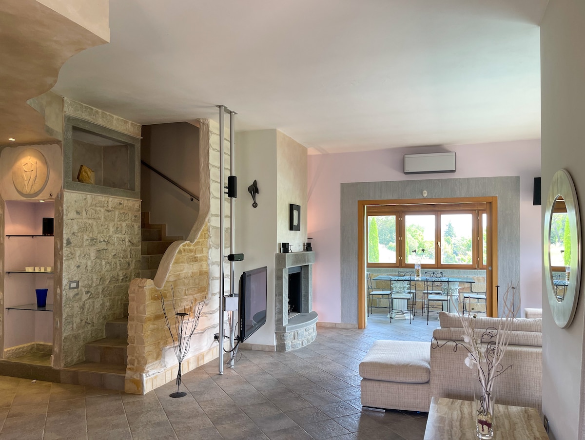 ‘Il Fienile’ is in an enchanting position immersed in the beauty of the Tuscan hills, with a breathtaking view of the surrounding countryside. It is located in the hamlet of Catignano in Gambassi Terme, just a few kilometres from San Gimignano. The house sits in a protected oasis surrounded by a beautiful private park with olive trees, a pond, pine trees and woods, where you can walk, relax and enjoy the pleasures of unspoilt nature. A unique experience entirely to be enjoyed.