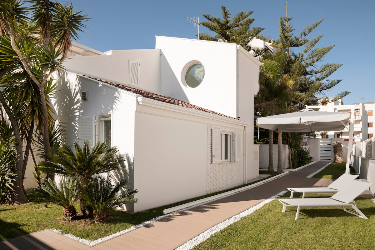 MaVa 1 Matrimoniale/Singoli Versatile e luminosa, questa camera è perfetta per coppie o amici grazie ai letti separabili. Il design pulito nei toni del grigio include un pratico angolo pasti e una zona lavoro con Coffee Corner (Nespresso e cappuccinatore). Il bagno si distingue per il doppio lavabo e l'ampia vasca/doccia. La veranda privata con arredi bianchi è ideale per il relax. A 300m dal mare, offre Wi-Fi, Netflix e colazione personalizzata in camera e pulizia giornaliera.