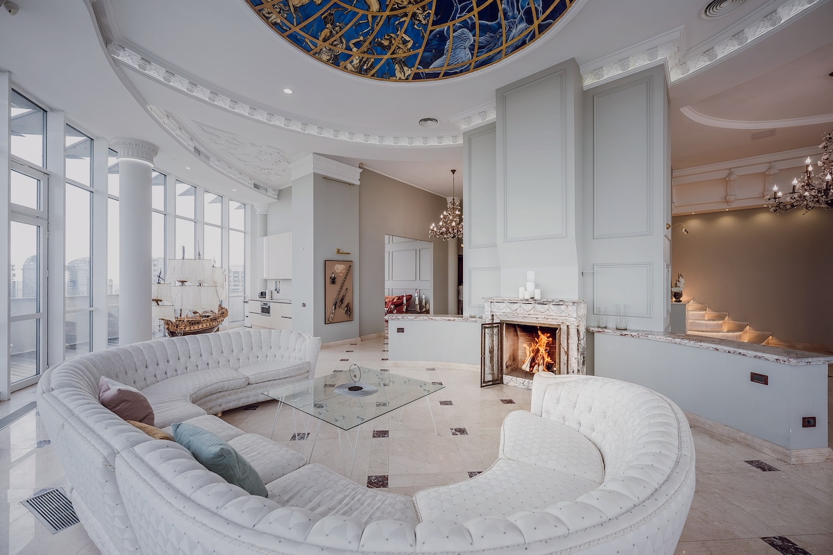 Kétszintes penthouse kör alakú terasszal Kijev szívében. Privát szabadtéri medence, kandalló, ólomüveg kupola és öt méteres mennyezet. Öt hálószoba, három fürdőszoba, irodaterem, könyvtár és házimozi hi-fi minőségű akusztikával. A konyhában minden készülék megvan a kényelmed érdekében. Márvány, neoklasszikus stílus, panoráma a Dnyeperre és a városokra – ez a hely azoknak szól, akik nem csak egy szállodát, hanem a legmagasabb szintet választják.