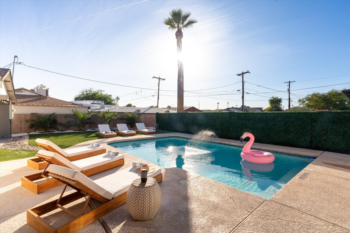 Újonnan felújított otthon csodálatos hátsó udvarral az Uptown Phoenix kiváló helyén! Nagyszerű szálláshely családok és barátok számára. 3 hálószoba van, kettő teljes fürdőszobával. Minden alapvető dologgal fel van szerelve. Élvezd a hátsó udvarban található menedéket medencével, grillezővel, valamint egy TV-vel, ahol sportot vagy bármi mást nézhetsz, amit csak szeretnél. Számos étteremhez és üzlethez közel. Mindössze 15 perc autóútra a Phoenix Sky Harbor International repülőtértől. Peloton bike!