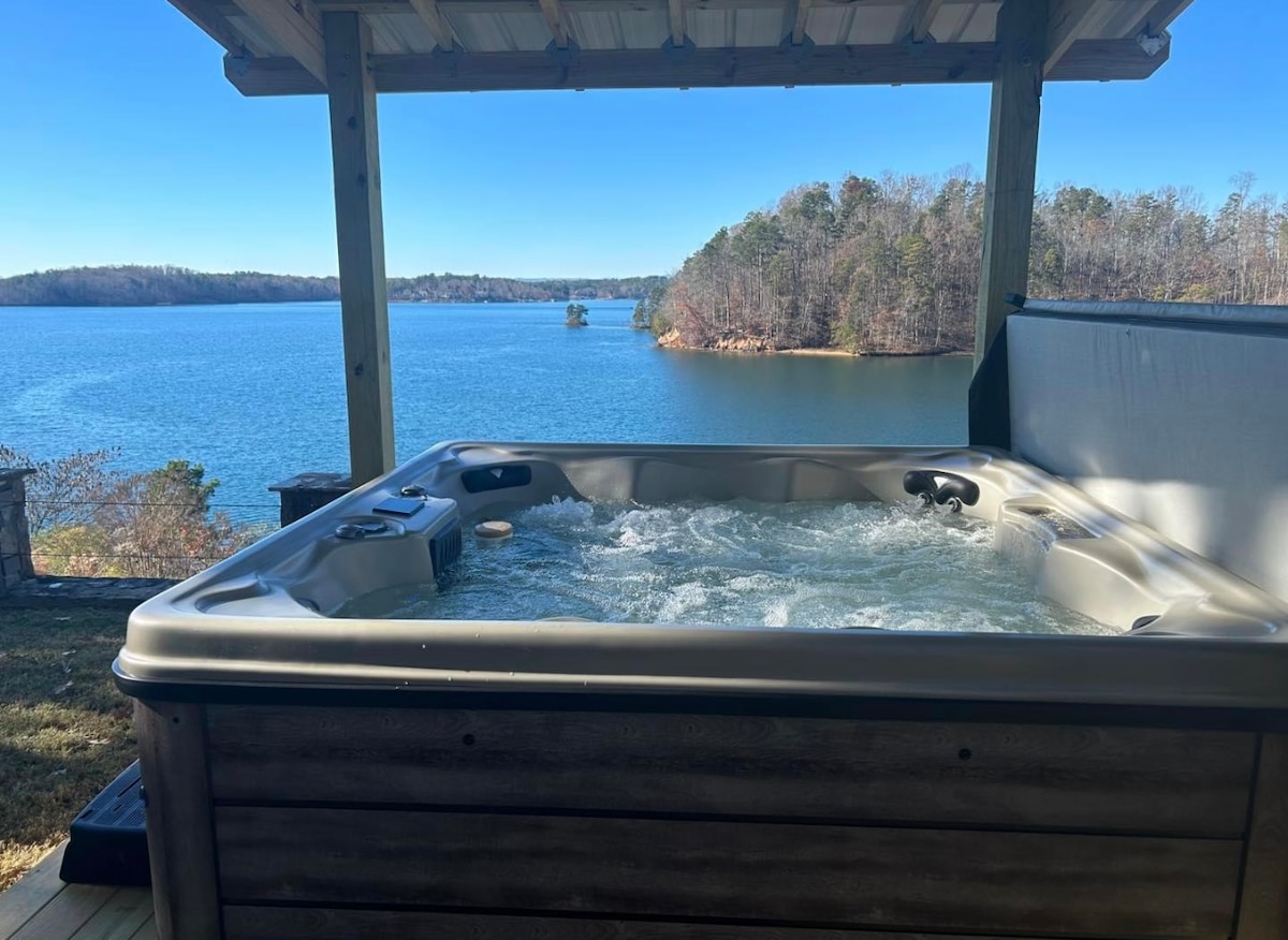 A rustic industrial style Lake Keowee lakefront escape that places you right on a panoramic point in a private cove. Welcome the outdoors in with the 6ft kitchen hinge bar window to the upper deck or enjoy the 6-seat hot tub on lower deck. Deep water dock tie off space is available. Guests enjoy the use of 2 standup paddle boards, and lakeside fire pit (guest provide firewood). Great cove sunsets! 15 minutes to Clemson and 1 min Lighthouse Restaurant. Please read all details prior to booking!