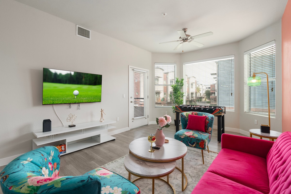 Brand New townhome in the heart of downtown Gilbert brings you everything you need for a comfortable stay surrounded by all the amenities of downtown urban living. Community features a heated pool, nearby walking path, and is located 300 steps from all of the downtown amenities. Quartz countertops, new appliances, electric fireplace, 4 flat-screen TV's, premium lot located next to pool and other amenities. Additionally front patio features a fire pit, sitting chairs and private Jacuzzi.