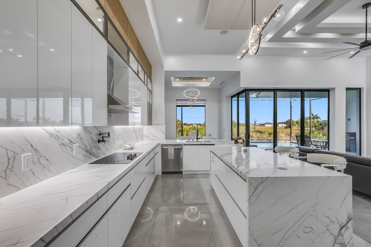 Felejtsd el az aggodalmaidat ezen a tágas és nyugodt helyen. Gulf Access, Luxury Pool Home - Élvezd a csodálatos kilátást a tóra! 4 hálószoba, 3 fürdőszoba és 3 autó túlméretezett garázs. Élvezd a nagy kültéri konyhát, a sós vizű fűtött medencét, a gyógyfürdőt és a képablakokat. A tágas nappali gyönyörű, hátsó megvilágítású LED-TÁLCÁS mennyezettel rendelkezik! A mesterfürdő nagy áztató káddal és két zuhanyfejjel rendelkező, túlméretezett kőből készült zuhanyzóval rendelkezik. Rövid hajóút Matlacha/ Pine Island felé. Útközben nincsenek hidak, csak csodálatos kilátás!
