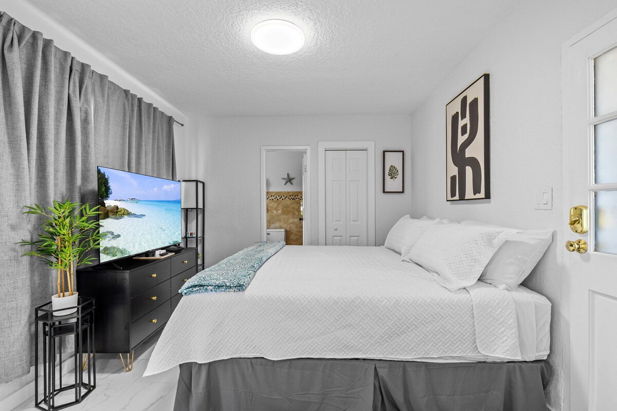 Escape to our sun-soaked 1-bed, 1-bath studio tucked in a 9-cottage tropical oasis on quiet Cyprus Ave. Steps from Chapel by the Sea, this lush garden hideaway boasts swaying palms, two heated pools and a two-minute stroll to Clearwater Beach. Inside, enjoy crisp modern décor, bright accents and turquoise touches that echo the sea. Peaceful and private, yet close to shops and restaurants, it’s spotless and a cozy retreat for two