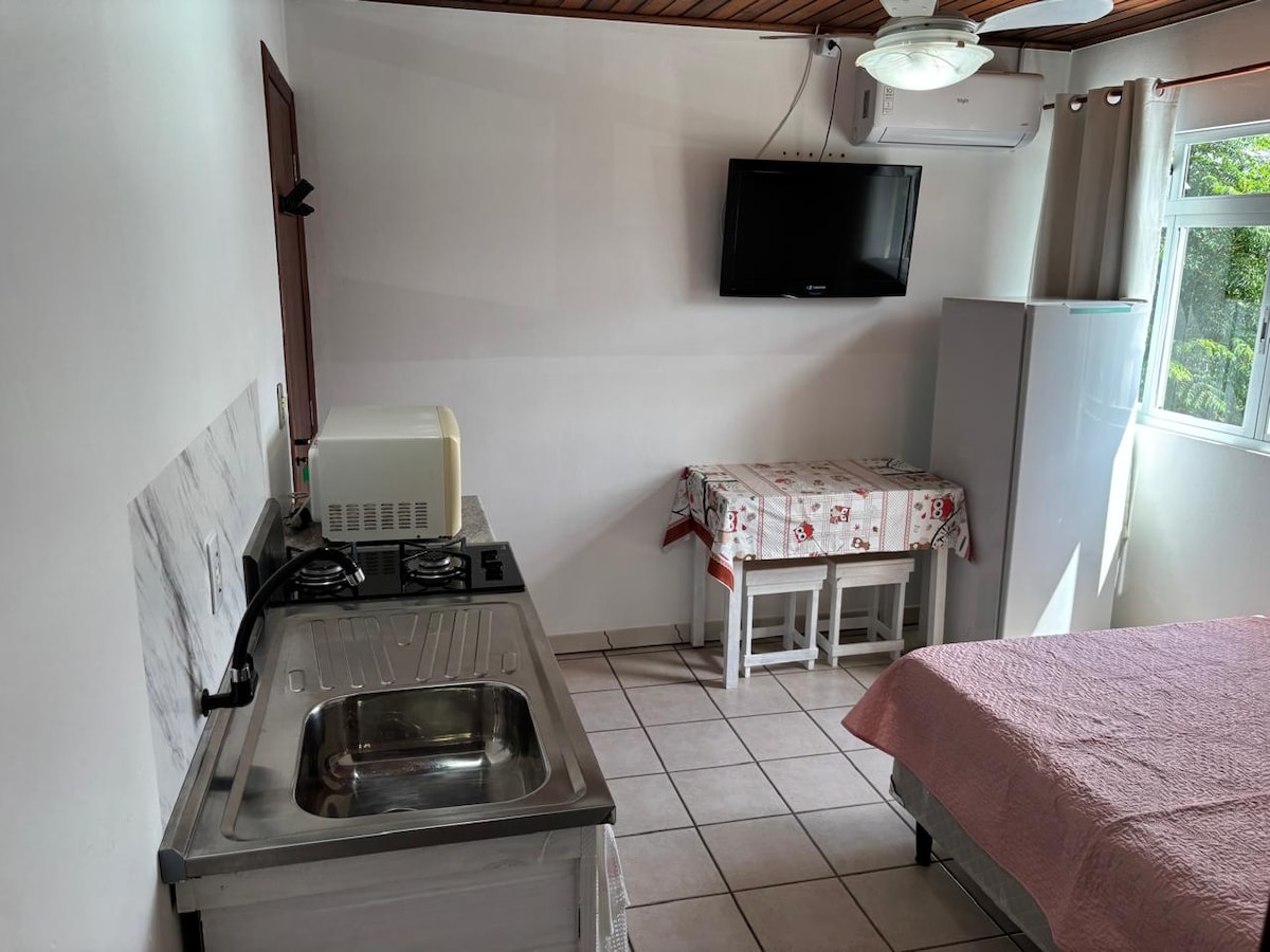 Kényelmes hely egy csendes helyen, Praia da Pinheirában, 700 méterre Praia de Baixótól, 2 km-re Praia de Cimától és 2,5 km-re Guarda do Embaú városától. Az apartman legfeljebb 2 felnőtt és 1 gyermek elszállásolására alkalmas; teljes konyhával rendelkezik tűzhellyel, mikrohullámú sütővel és hűtőszekrénnyel. Szoba karosszékkel, puffal és Smart TV-vel 32 hüvelyk. Hálószoba franciaággyal, ruhatartóval, ventilátorral és elektromos zuhanyzóval. A hangulatos, grillezővel ellátott erkély mellett.