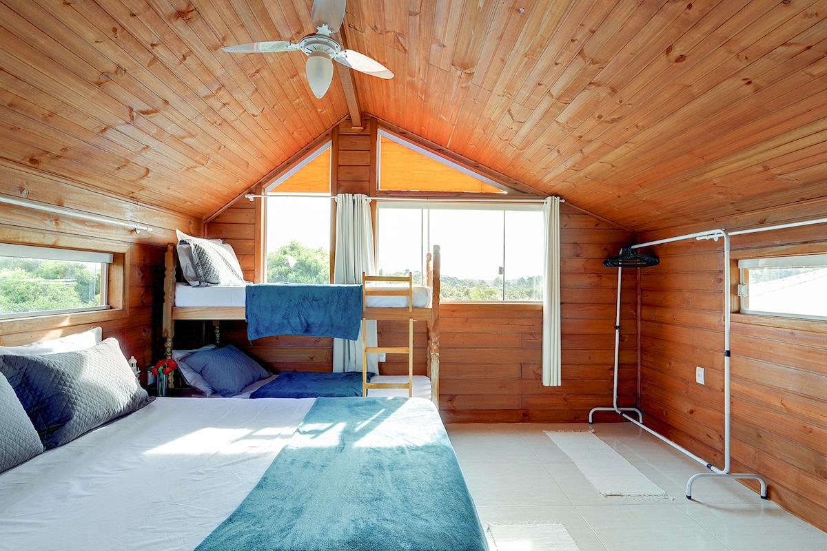 A acomodação fica no piso superior, conta com uma suíte com cama de casal, SmarTv, ventilador potente, roupas de cama e banho, geladeira, banheiro completo e cama auxiliar no caso de 3 hóspedes. Acesso independente à suíte, que é totalmente privativa.