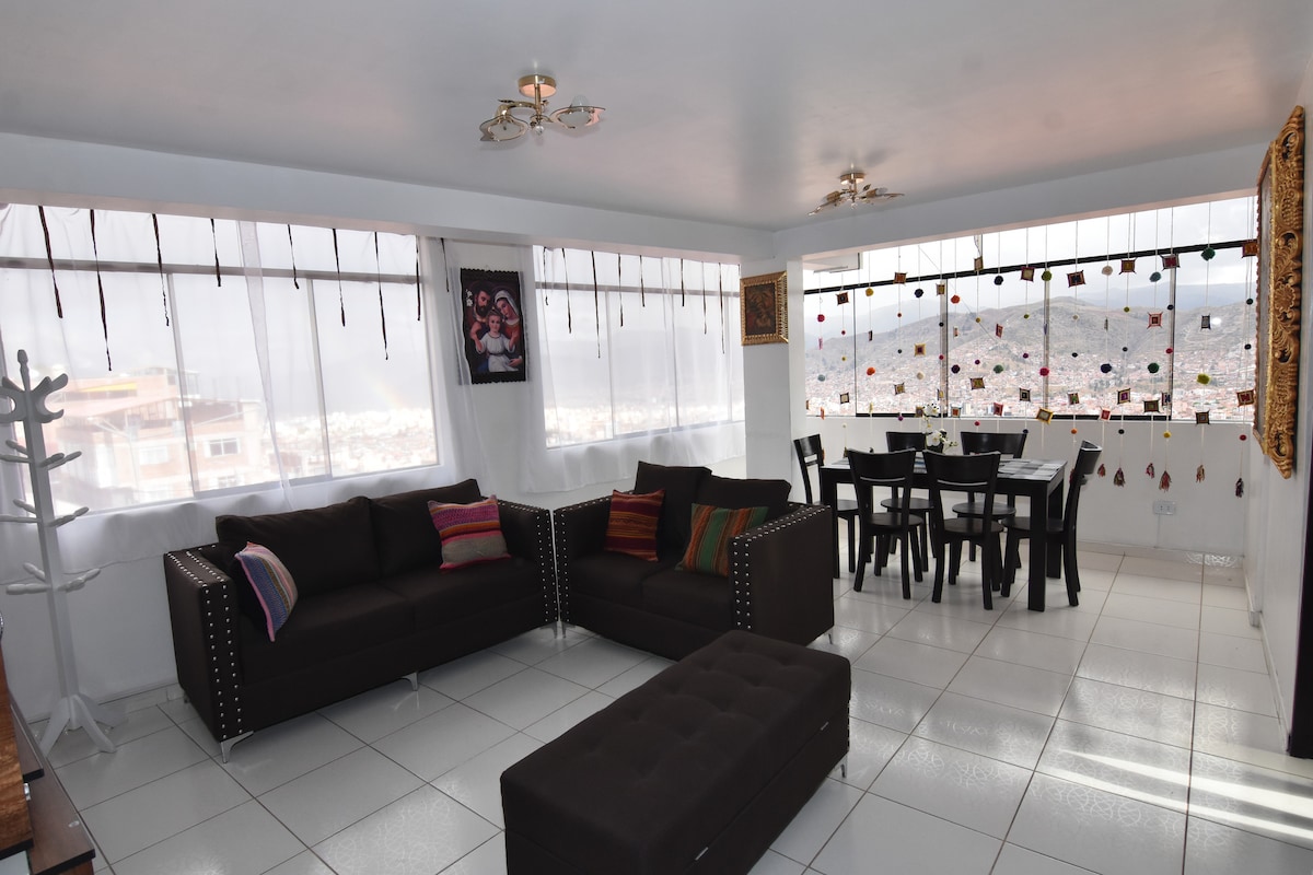 A group of up to five persons will feel comfortable in this independent appartment on the second floor of our house, located in a safe city quarter, at 25' walking and a 8' taxi drive to the historical city centre. Three lightfull bedrooms and a lounge with well-equipped kitchenette enable you to arrange your stay in Cusco as you like. Kitchenette and the new bathroom count with 24h hot water.