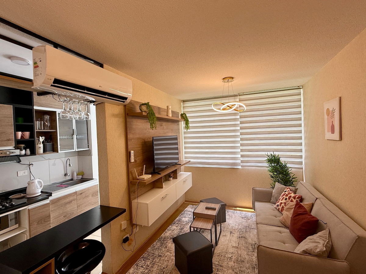 Üdvözlünk a piurai menedékedben! Modern, friss és minimalista hely Piura szívében. A fehér és szürke lágy palettájával, zöld részletekkel, amelyek életet és nyugalmat hoznak, ez a lakás ideális azok számára, akik stílusosan szeretnének pihenni. Tökéletes csendes kiruccanásokhoz és kényelmes foglalásokhoz. Az apartman teljes konyhával, TV-vel és streamingszolgáltatásokkal felszerelt nappalival, két tágas hálószobával és légkondicionálóval rendelkezik a nappaliban a nagyobb kényelem érdekében.