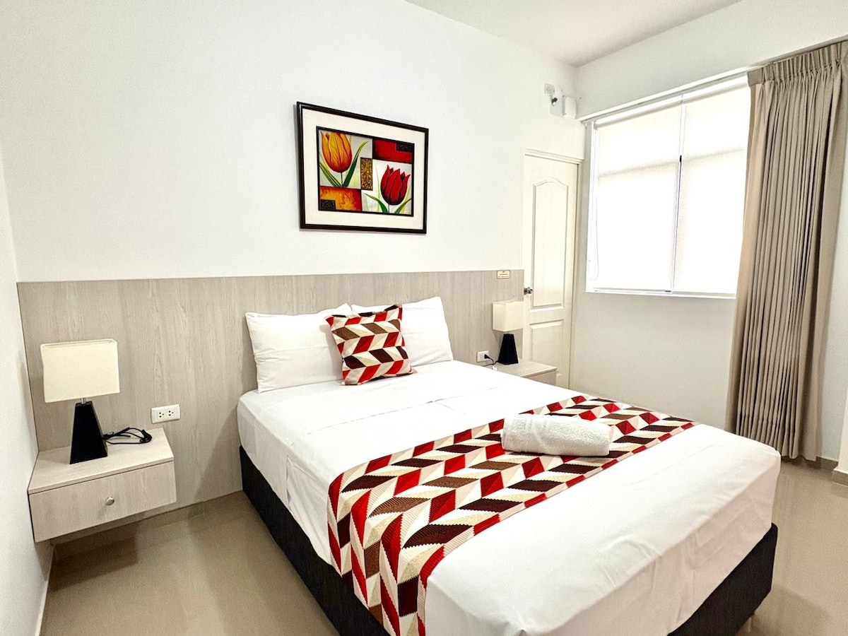 Gyönyörű, teljesen felszerelt házassági szoba munkaterülettel az El Golf társasházban, referenciaként az UPAO egyetem egész területén, Piura városának nagyon biztonságos és exkluzív területén, mindössze néhány percre a különböző látnivalóktól és mindössze 15 percre a repülőtértől. A szobában kényelmesen érezheted magad, ha hozzáférhetsz a medencéhez és a grillezőhöz.