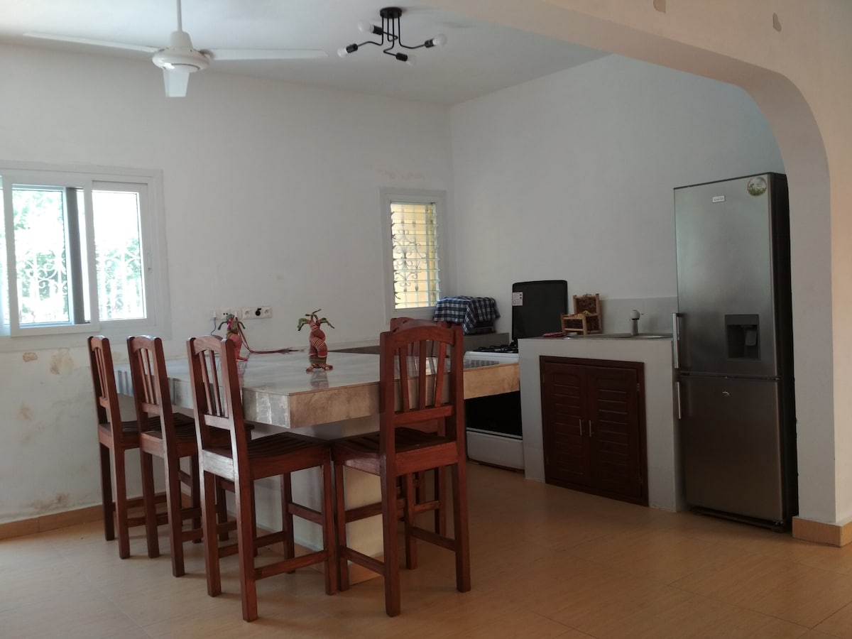 Nous vous proposons une villa en R+1 située au cœur du centre-ville de Majunga près de tous les sites et commodités. Sa grande cour est un espace où les enfants auront la possibilité de jouer et de s'exprimer, et est dédié aux barbecues en famille ou entres amis. Les deux chambres et le séjour sont équipés de tv avec un accès à Canalsat et au Wifi. Nous mettons à disposition de nos hôtes un service quotidien de gardiennage et de conciergerie (ménage, groupe électrogène, surpresseur d'eau).