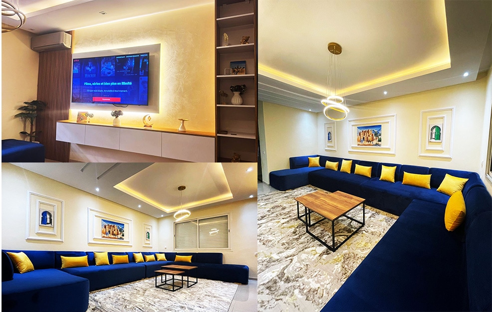 Ez a családi otthon közel van minden látnivalóhoz és kényelmi szolgáltatáshoz. közel az Agadir strandhoz körülbelül tíz perc gyalog vagy 5 perc autóval. közel a soukhoz (piac) 15 perc gyalog. A 3. típus az első emeleten található, amely egy hálószobából áll, amely egy franciaággyal és öltözővel, az étkezőre néző, teljesen felszerelt konyhából és egy tágas marokkói nappaliból áll. külön WC, fürdőszoba és erkély. új otthon.