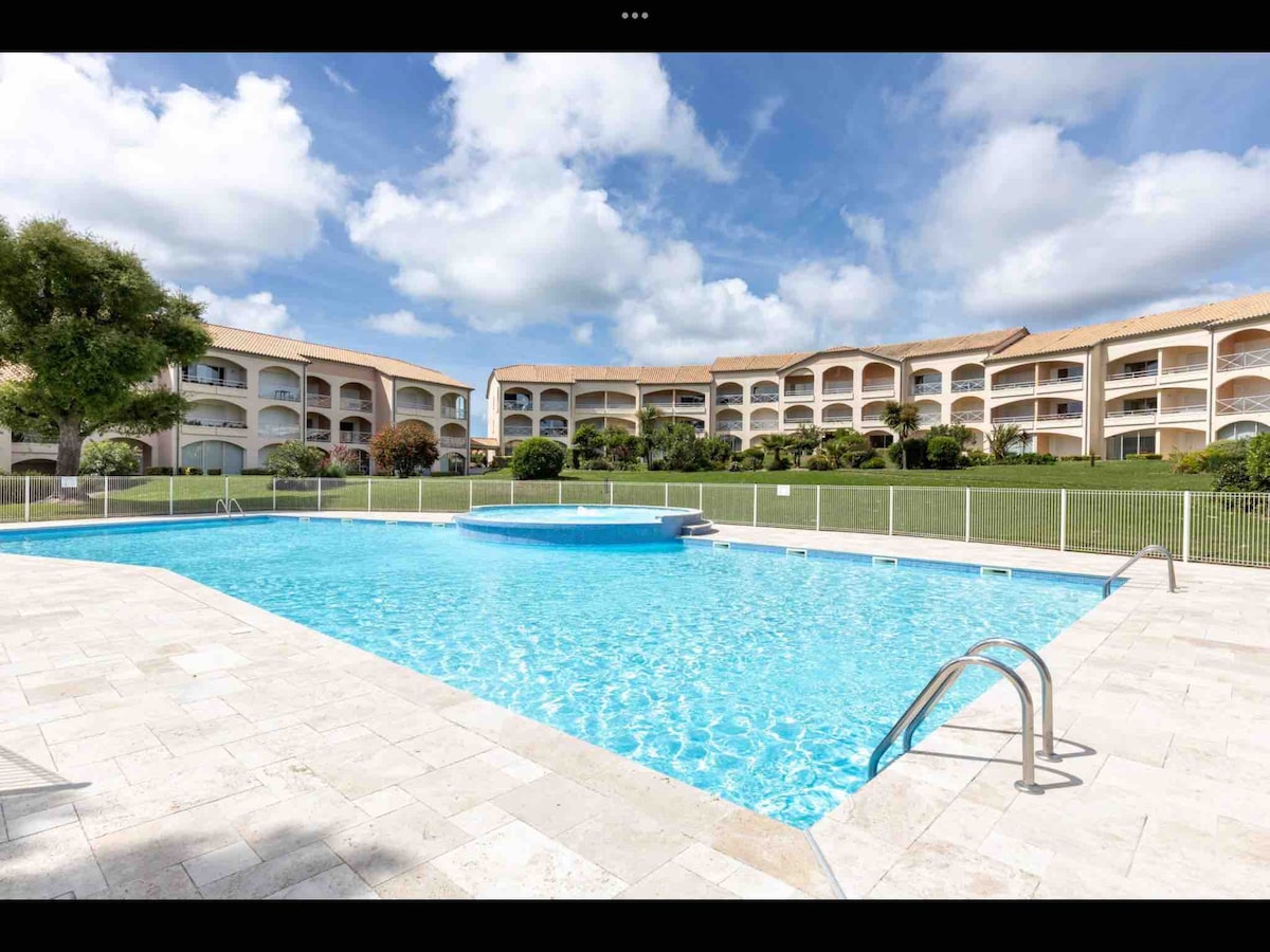 Zöld környezetben, Landes ház 4-6 ággyal a Moliets et Maà golfpálya szívében. Hozzáférhetsz a számos úszómedencéhez, beleértve a június közepétől szeptemberig fűtött medencét, valamint a rezidencián belüli sportlétesítményeket ( kosárlabda, pingpongasztal, pétanque...) The ocean including its cork oak beach is 800m walk or bike or central beach 1.2kms away
