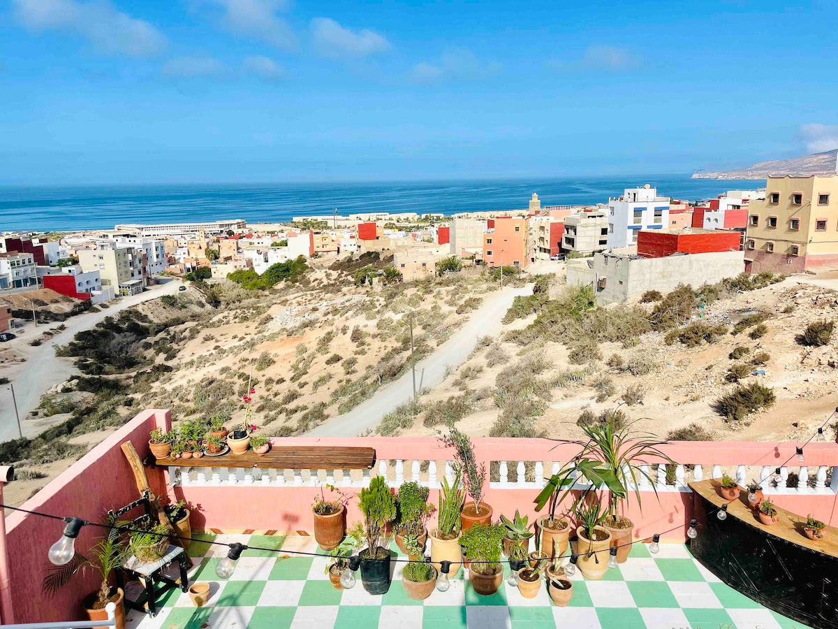 On a humble street perched atop the lovely surf town of Tamraght, you will find our house. Our rooms are light and breezy, with every detail handpicked, and lovingly put together. From our spacious rooftops, you have an expansive view of the sea, of the whole charming town, and the mountains. A full 360 panorama. Perfect for yoga, wave checks, and lounge. 5-10 min walk to shops, restos, and 15 min to the beach. We can cook up meals, and curate experiences. BREAKFAST (w/a view) INCLUDED.