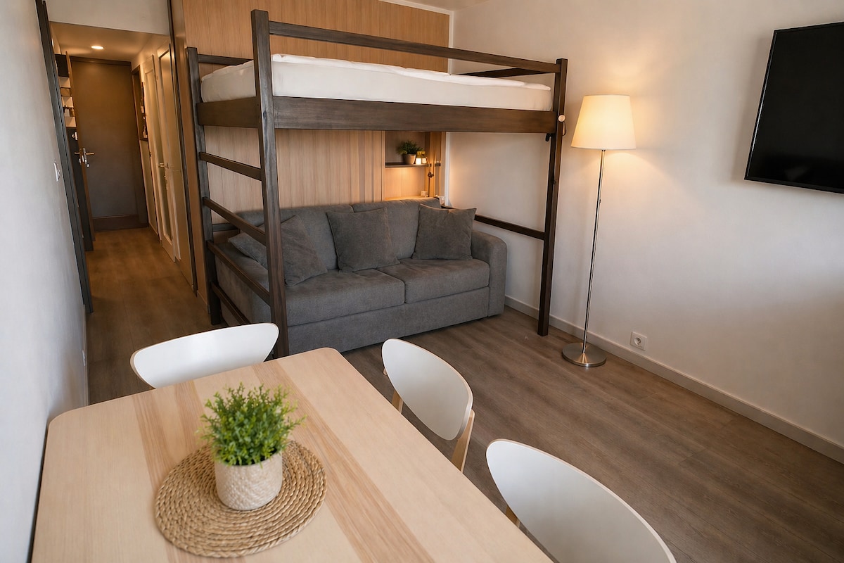 Divisible studio 4 pers Aime 2000 Le Paquebot des Neiges La Plagne. 2 stars furnished tourist accommodation 3 crystals Paradiski Dupla ⚠️üvegezésű szigetelés 2022-ben felújítva ⚠️ 2150 m tengerszint feletti magasság, kilátás a Mont Blanc-ra, sílécek a lábadon 26 m2, a völgyre és a Mont Blanc-ra néző erkély, a rezidencia 10. emeletén bevásárlóközpont a rezidencián Ingyenes telemetria a Plagne központba vezető rezidencián, ingyenes transzferek paradiski estate 425 km 236 slopes hálószoba levehető válaszfallal Külön WC Törülközőlepedő nem áll rendelkezésre
