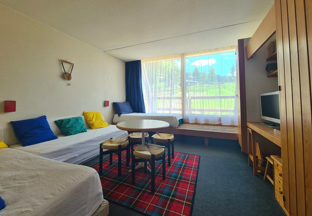 Arc 1600 Résidence Adret Immeuble C.Perriand Charmant studio 28 m2 + terrasse 8 m2. 4 cristaux Paradiski Intérieur lumineux, vue dégagée sur la nature, vous vous y sentirez bien été comme hiver L'été, profitez de la piscine extérieure de la résidence L'hiver, profitez de la proximité des pistes de ski accessibles à pied (casier à skis au même niveau à l'entrée de la résidence) ESF à 50m Résidence gardée et calme Cœur de station 150m à pied : commerces, restaurants, services, activités Non fumeur