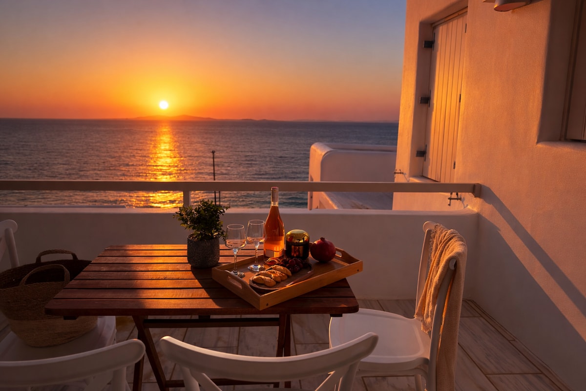 Welcome to our cozy apartment nestled just a few minutes away from the heart of Mykonos town. Ideal for families, couples and friends with parking space and easy access on the streets filled with cafes, market, bakery and more! Features: -Three queen sized beds and three bathrooms, two of which en-suite -Air conditioning -Wifi Internet up to 200mbps speed -Fully equipped kitchen -Spacious living room leading to an outdoor seating terrace with sunset and sea views -Washing machine and dishwasher