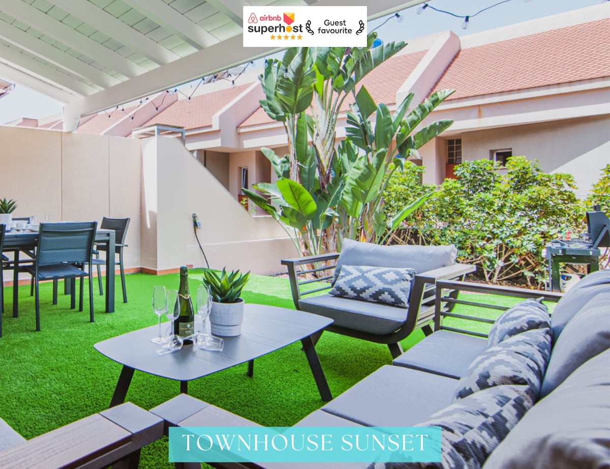 Exkluzív sorház terasszal és panorámás jacuzzival. Élvezd a hangszigetelt, többfunkciós szobát mozival, PlayStationnel és bulizós területtel! Biztonságos pihenés társasházi medencékkel, grillezés a trópusi udvarban és elegáns belső terek. Prémium felszerelés: teljesen felszerelt konyha, légkondicionálás minden szobában, saját garázs, gyors Wi-Fi és mosógép/szárítógép. Tökéletes környezet a felejthetetlen pillanatokhoz a barátokkal vagy a családdal, nem messze a Costa Adeje látványosságaitól.
