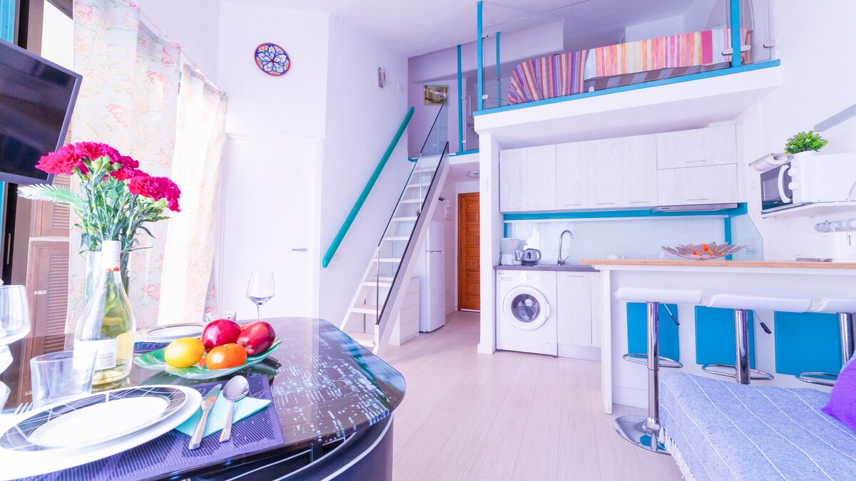 Apartamento de diseño, ideal para parejas y viajeros, ubicado en pleno centro de Los Cristianos, muy cerca de todos los servicios turísticos y a 2 minutos a pie de playa. A pocos minutos caminando llegarás a sitios como el Puerto Marítimo, Plaza de la Iglesia, Playa las Vistas, San Telmo, Playa de los Cristianos. El apartamento se encuentra a 10 minutos en autobús del famoso parque acuático Siam Park y de su centro comercial Siam Mall. El apartamento consta de 1 dormitorio totalmente equipado
