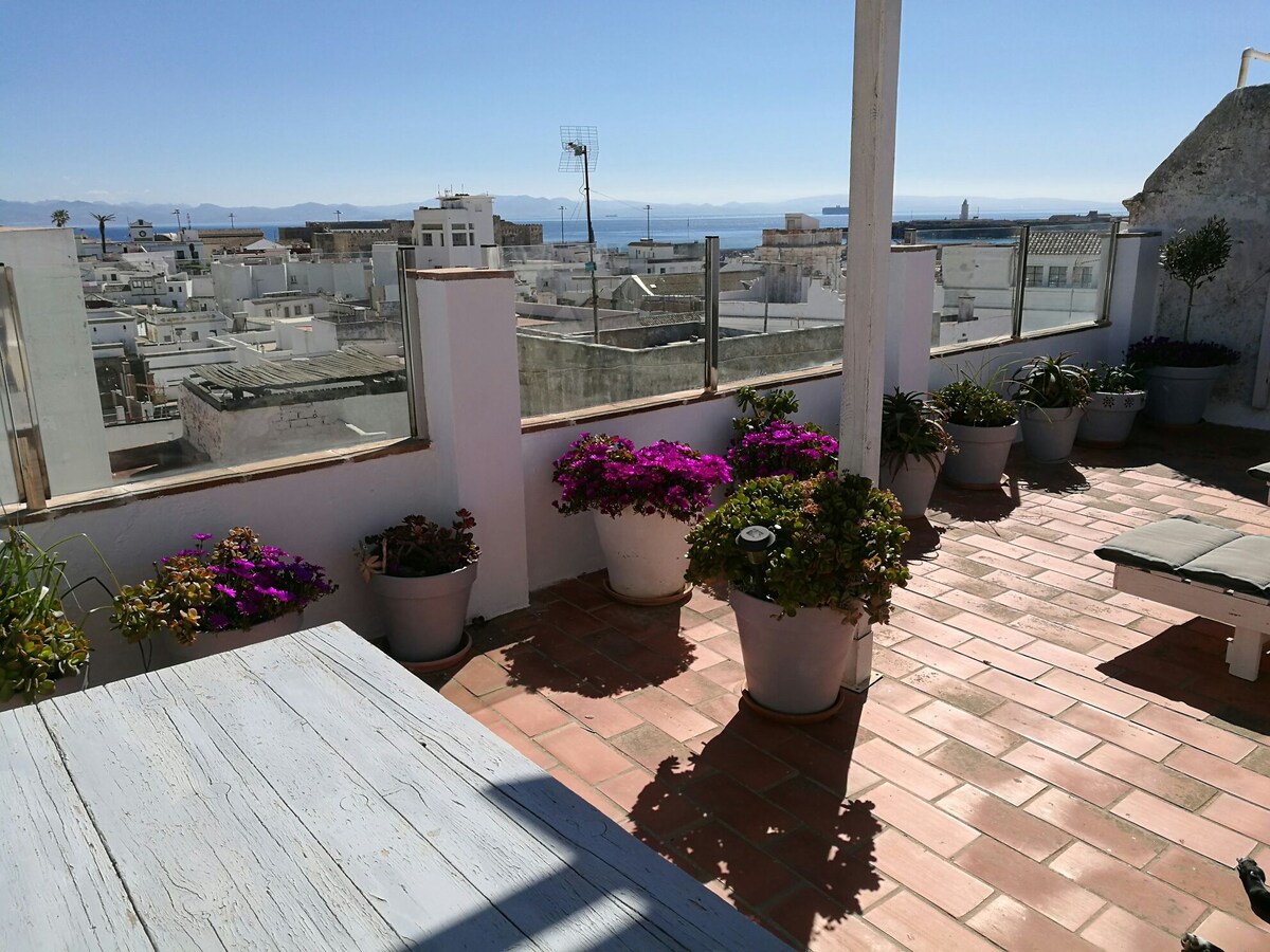 Ático con mucho encanto al lado del castillo, tiene una gran terraza con vistas al casco histórico, al puerto y al mar. Se encuentra a menos de cinco minutos a pie de las mejores playas de Tarifa. Es muy luminoso y está totalmente equipado. Consta de salón con chimenea, comedor, cocina americana, un dormitorio muy amplio, cuarto de baño y una gran terraza. Es un alojamiento con un encanto especial por su espléndida terraza con vistas, su decoración, su luminosidad y su inmejorable ubicación.