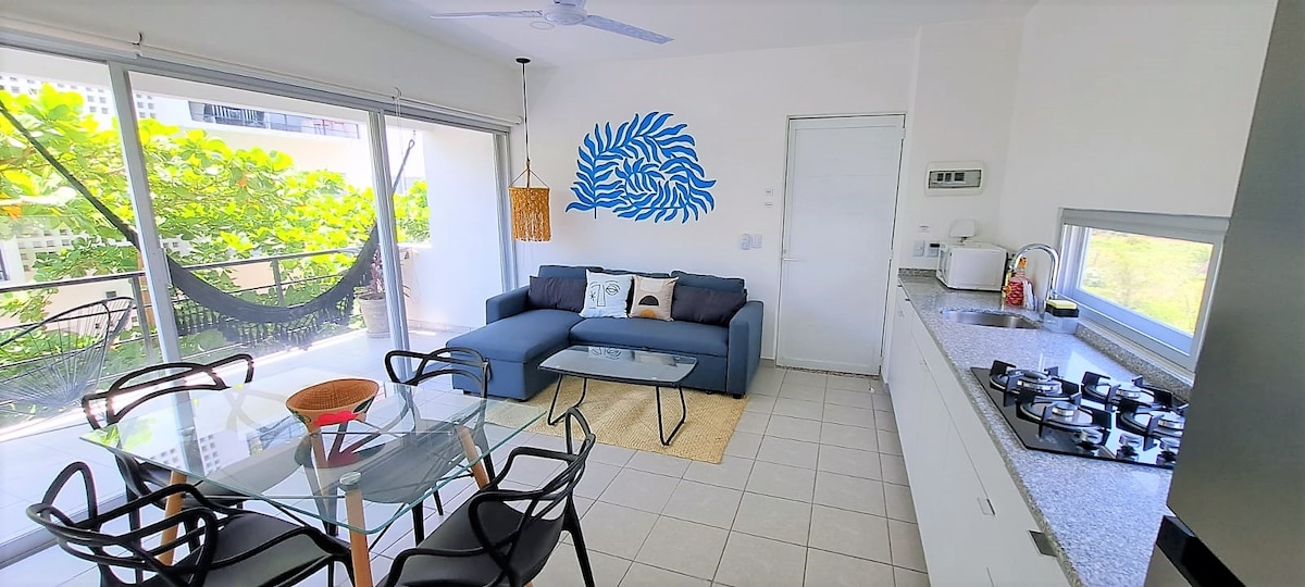 🌊Departamento con increíble terraza en planta baja, 3 Rec (principal con jacuzzi), 3 baños, cocina, sala y comedor equipados Wifi de 100 Megas, ideal p trabajar Home Office, juegos de mesa, raquetas y jenga gigante 🏝️Hermosos jardines tropicales, lagos y albercas para disfrutar de una agradable caminata 🌊Acceso a albercas con jacuzzi, juegos infantiles, snack bar, mesas de ping pong y paseo en Kayak 🌞Para unas vacaciones familiares, pregunta por el departamento de arriba con 2 recamaras