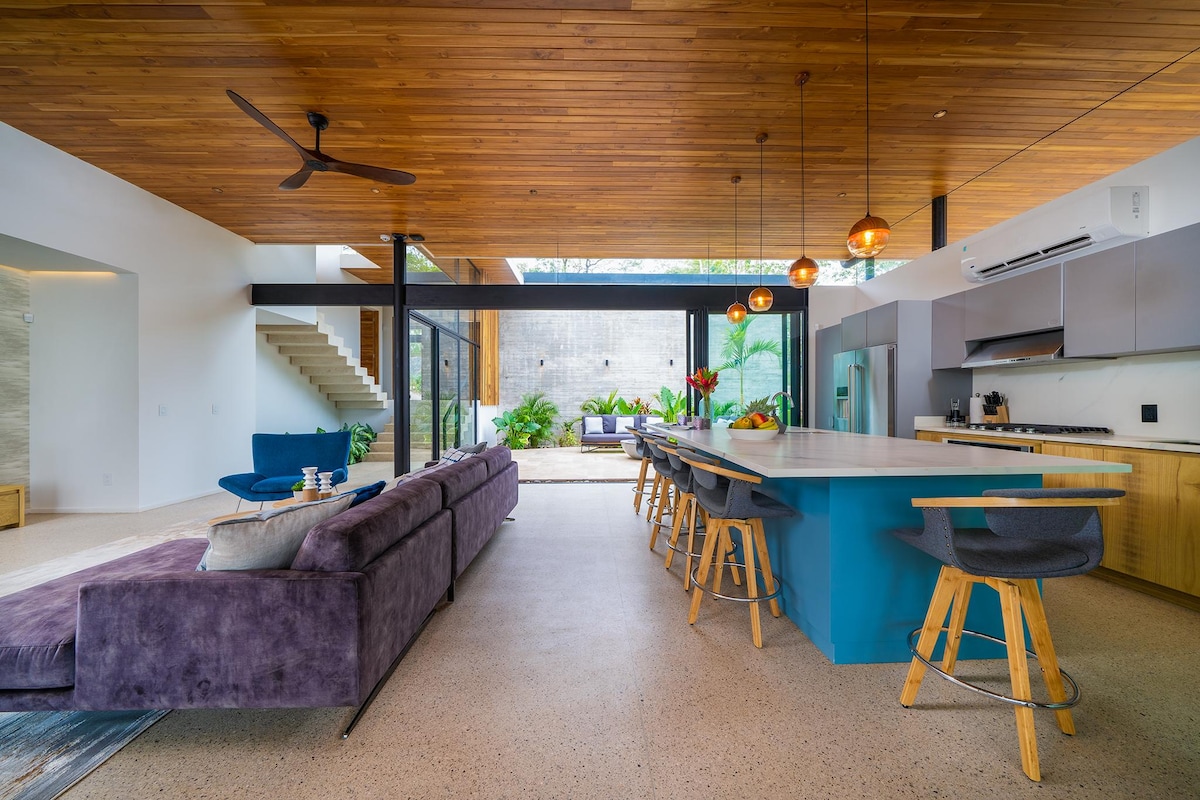 A Playa Grande-tól, Costa Rica legjobb szörfös strandjától rövid sétára található modern, fenntartható otthon egy álomszerű trópusi menedékhely. A díjnyertes építészek, az Inverse Project által tervezett 4 hálószoba saját fürdőszobával rendelkezik, 9 alvóhellyel. Pihenj a nagy medencében, a függőágyakban és a hintában, vagy lazíts a fedett kültéri teraszon, amely egy buja kertben található. A rövid sétányira található szörfdeszkákkal és élénk éttermekkel ez az otthon a kaland és a kikapcsolódás tökéletes keverékét kínálja.
