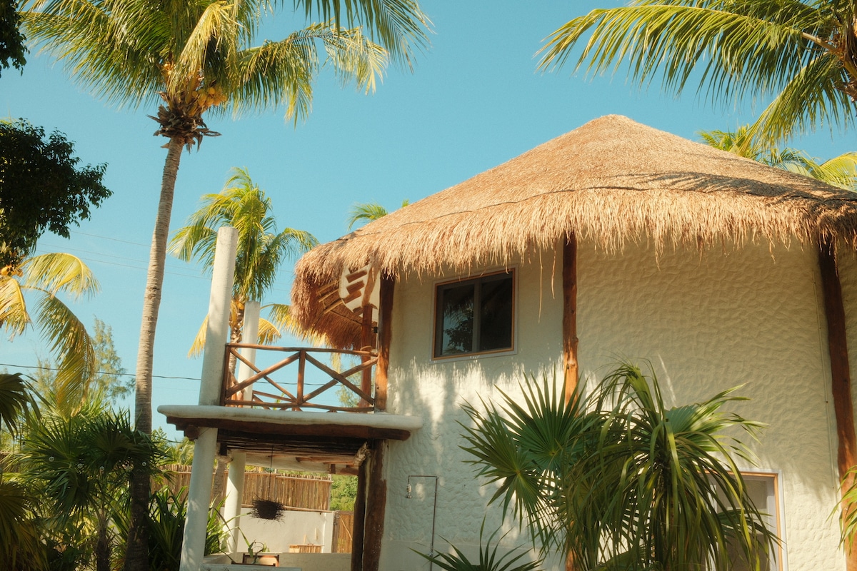 Beautiful loft ideal for couples or families with 1–2 kids, located in Punta Cocos—the quietest area of Holbox. Enjoy a peaceful stay away from the crowds, with stunning sunsets from your balcony and a nearly private, shallow turquoise beach just steps away. The Yum Balam building offers comfort, nature, and tranquility. Plus, with Starlink Wi-Fi up to 50 Mbps, staying connected is easy while you unwind in paradise.