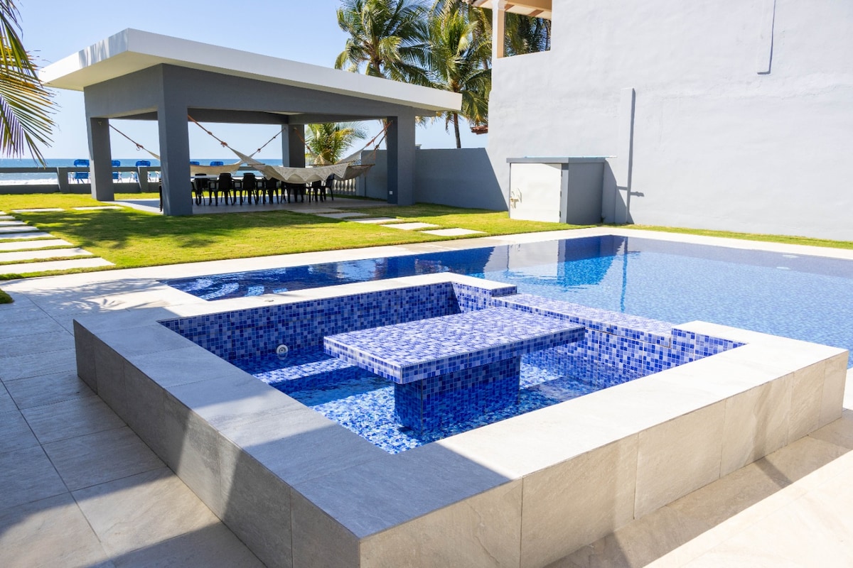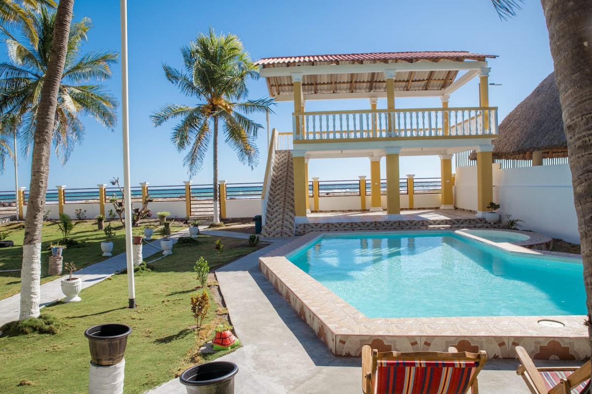 Front beach, spacious accommodation is unique , in the best area of the coast of the sun , with different spaces for you to enjoy and if you prefer you can have a additional kitchen service, 30 minutes from the airport, we are petfriendly, spacious pool , Hamaqueros ranchos, gardens , 4 Bedrooms, 6 bathroom, it is usually rent for 15 people but has more rooms to host, you will not want to leave the property , but there are more activities