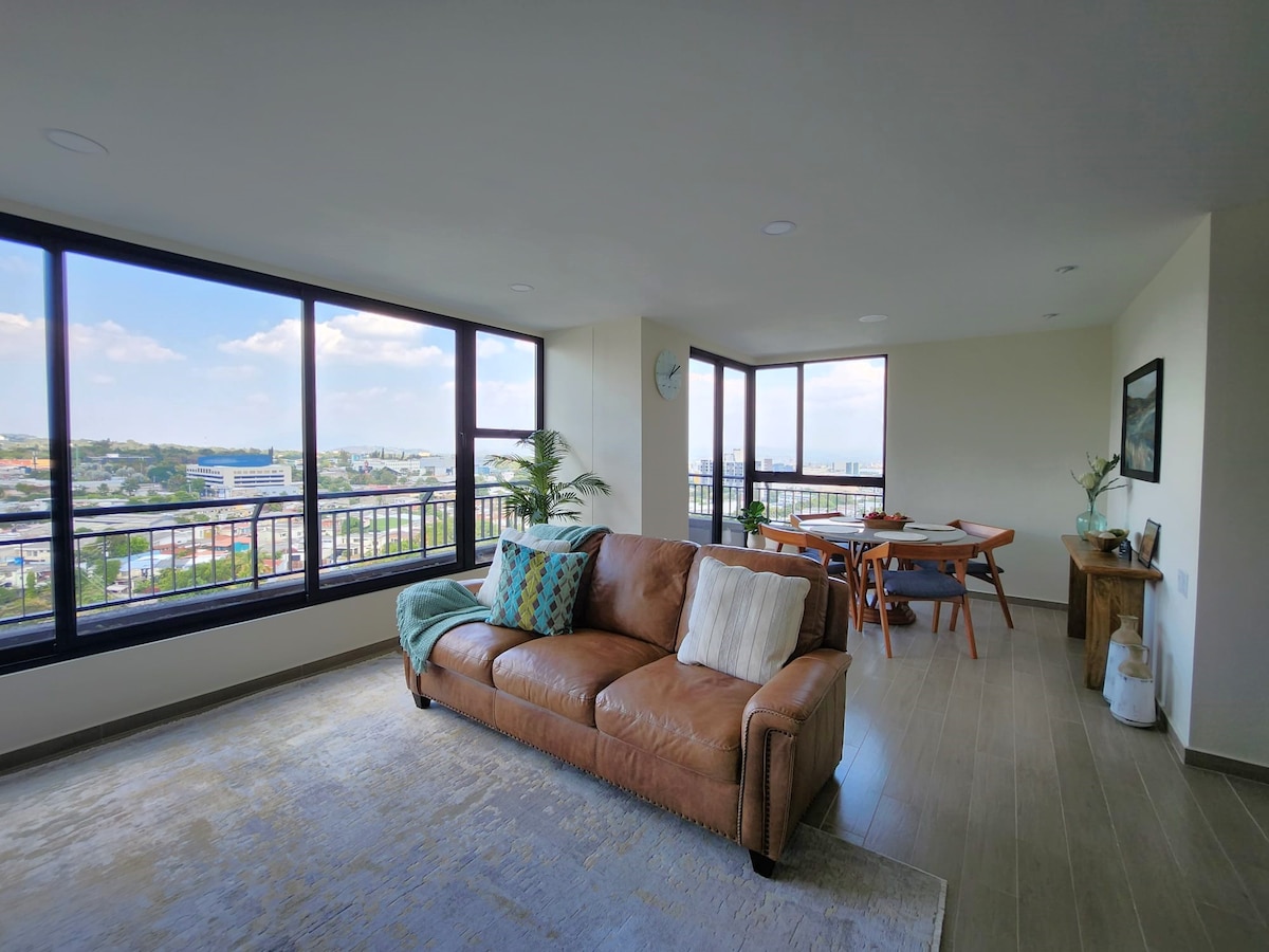 Modern apartman San Salvadorban városi kilátással.