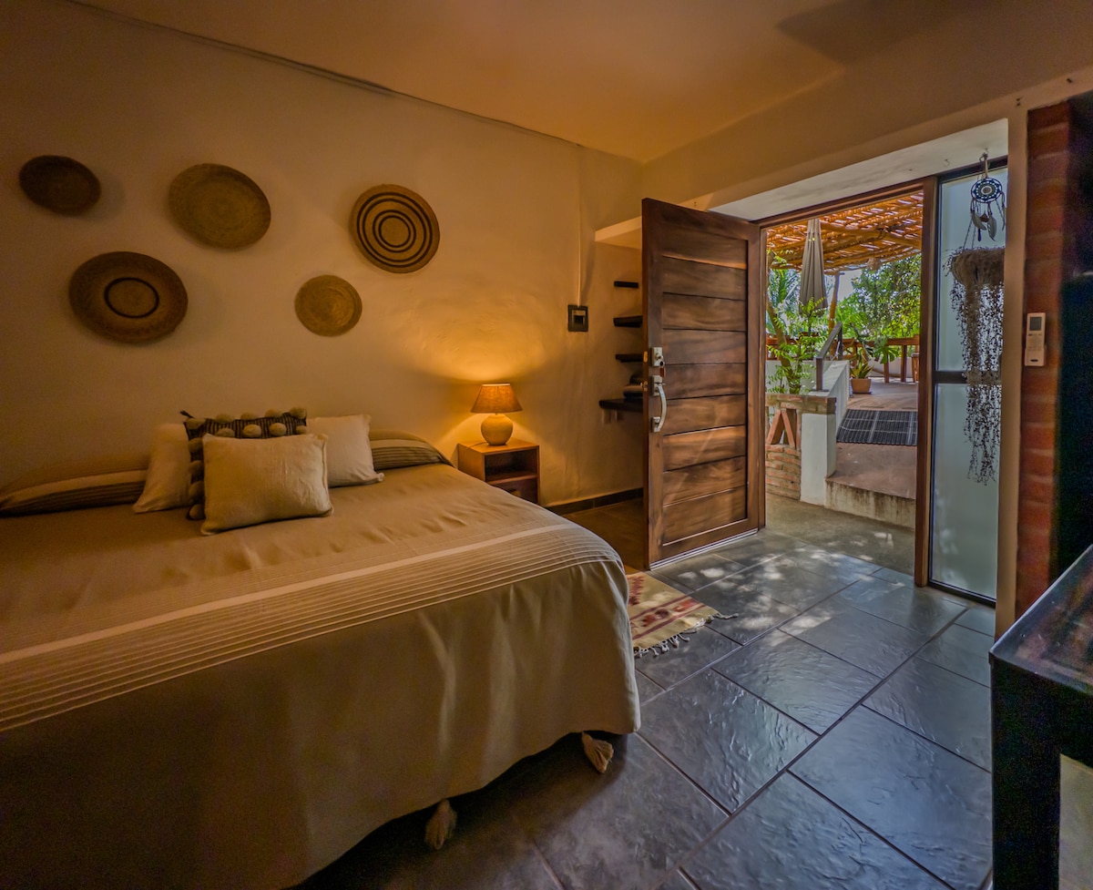 Üdvözlünk a békés búvóhelyeden Sayulita déli részén. A Casa Aurorában található hangulatos, légkondicionált stúdió saját bejárattal rendelkezik az utcáról, saját terasszal, amelyet buja kert vesz körül, és közös medencével az út túloldalán. Mindössze nyolc perc sétára van a város szíve, így élvezheted az éttermek, a szörfözés, a kávézók és a boltok közelségének kényelmét, ugyanakkor egy csendes lakóövezet nyugalma is vár rád.