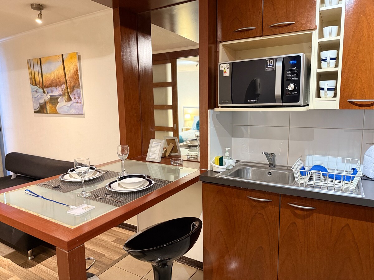 This apartment is ideal for relaxing and enjoying the city. It's centrally located, between the Santiago Centro and Providencia districts, one of the best locations in the city. It offers beautiful views of San Cristóbal Hill and the Sky Costanera. It's just a 3-minute walk from the metro and buses. Includes: Free Wi-Fi, a fully equipped kitchen, sheets and towels included, a large bed with a large Smart TV. Self-service entrance with a key, allowing you to arrive at any time.