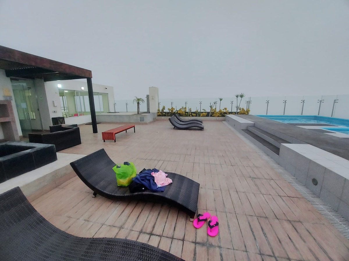 Cozy studio right across from the San Miguel boardwalk and Media Luna Park! Walk by the ocean, relax, and enjoy quick access to Costa Verde, Miraflores, Barranco, Arena 1, Costa 21, and the airport. You'll have 24/7 security, fast Wi-Fi, and a Smart TV with Netflix, Disney+, HBO, Prime Video, and YouTube Premium. Perfect for travelers looking for comfort, great views, and a peaceful stay by the sea.