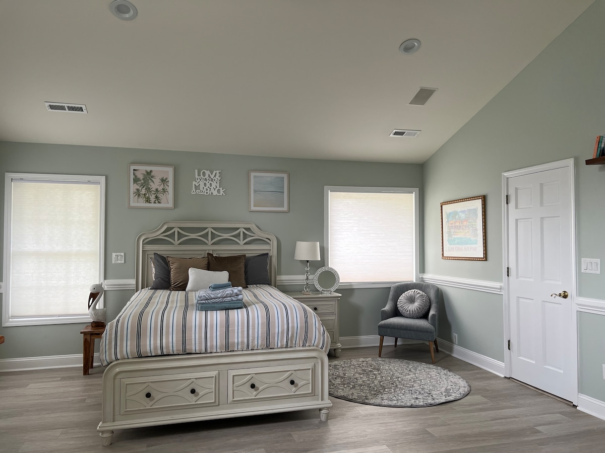 Renovated Master Bedroom Suite with shiplap walls, whirlpool tub and bidet toilet. Very Spa like and perfect for the single or couple that want to get away. Easy walk to beach., farmers market and outdoor concerts . Walking distance to eateries Your room has its own entrance on second story. Large screened in porch also yours to enjoy! We have Roku TV . New bedroom furniture and mattress with adjustable bed . Not set up for children safety.