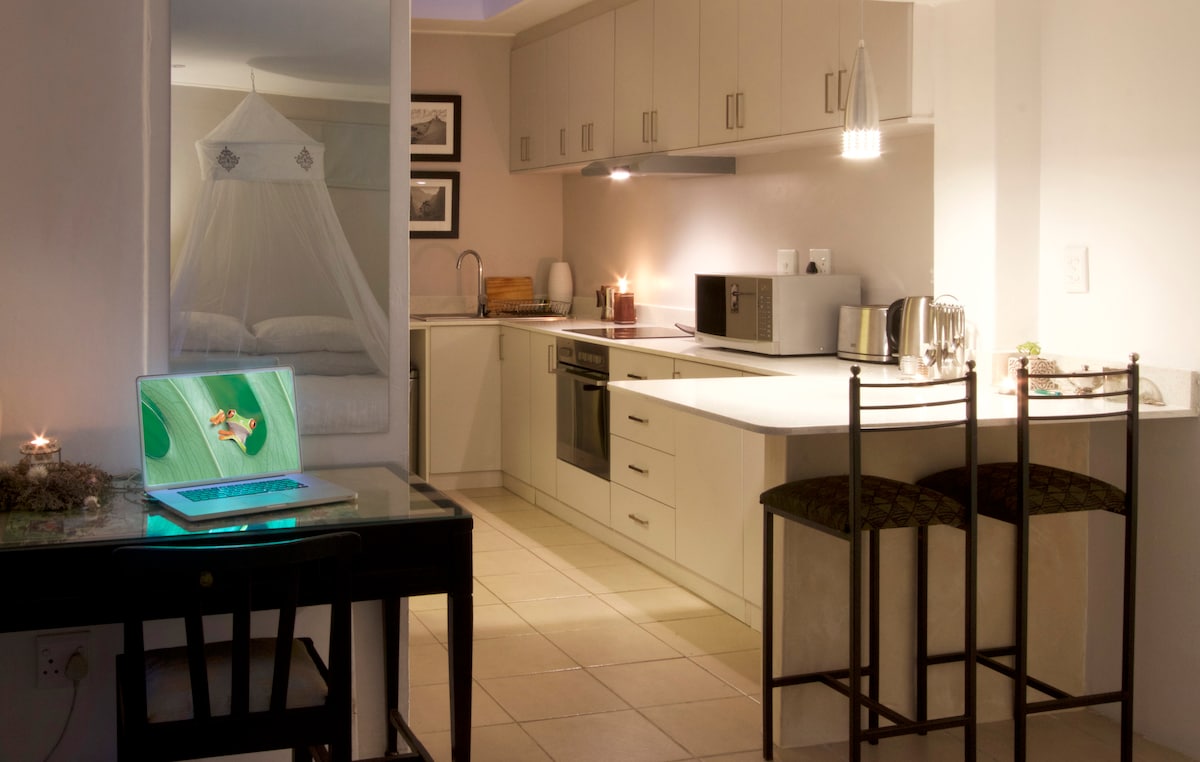 Fényűző, makulátlan, világos és kényelmes, légkondicionált stúdióház francia ajtókkal, amelyek a teraszra és a napenergiával fűtött, sós vízzel klórozott medencére vezetnek. Lámpák, tévé, dugók és Wi-Fi funkció a terheléscsökkentés során. Közel a Constantia borútvonalhoz, számos kiváló étteremhez és bevásárlóközponthoz. 30 perces autóútra a repülőtértől, Fokváros központjától, Claremonttól, a Muizenberg és Hout Bay strandoktól, Simon's Town-tól, Kalk Baytől, Tokaitól, Newlands Foresttől, a Kirstenbosch Gardens-től és a V&A Waterfronttól.