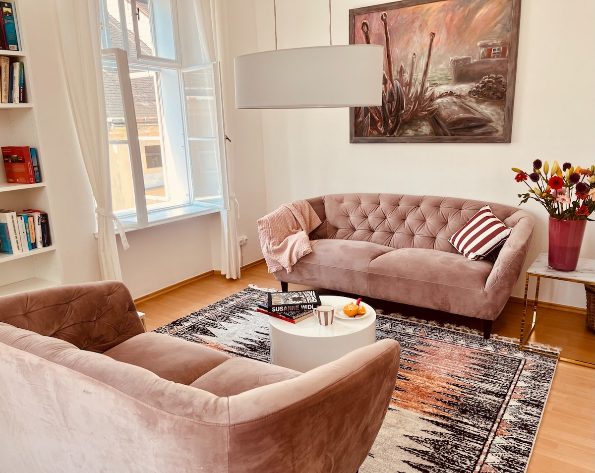 A szőlőültetvényekre nyíló hangulatos kilátás rendkívül gyönyörű belső terekkel rendelkezik, amelyek maximálisan jó érzést keltenek. Apartment „Schön” - Szitanyomás méretű, két irányba néző üveg előlap, szőlőültetvényekre néző fürdőkád, mennyei franciaágy, privát szabadtéri terület és a közvetlenül a szomszédban található, felső felszereltségű közös konyha. Rengeteg hely és sarok, ahol szívesen meginnál egy pohár bort.