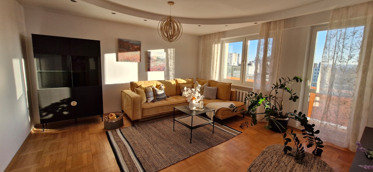 Stílusos lakás 3 hálószobával és gyönyörű, napfényes nappalival. Meghívunk egy világos és tágas lakásba, amely tökéletes családoknak, baráti társaságoknak vagy üzleti utazóknak. Elrendezés és szolgáltatások: ✨ Három kényelmes hálószoba: főszoba kétszemélyes ággyal, két további szoba egyszemélyes ággyal ✨ Tágas, napfényes nappali nagy, kényelmes, kihúzható sarokkanapéval, ✨ Nagy konyha étkezővel – teljesen felszerelt, ✨ Külön WC és kényelmes fürdőszoba mosógéppel.