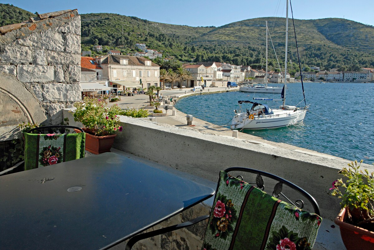 Apartment is located on the second floor of the old stone house right on the sea. It is 5mins walking distance to the promenade and just above the beach. It has fully equipped kitchen, one bedroom, a living room, a bathroom and a private balcony with a view over the sea and Biševo island. It is equipped with LCD tv, air condition, wi-fi, ceiling fan in bedroom (in winter time heater if necessary). With the apartment rental comes the possibility of using a double seated kayak during the stay.