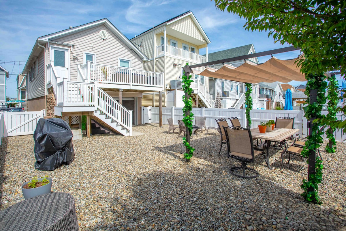 Enjoy the Jersey shore in this new & fully renovated beach home. This stylish bungalow features a backyard oasis with an outdoor grilling station & private outdoor shower. The open concept floor inside plan boasts quartz kitchen counters, new stainless steel appliances, and a stunning full and additional 1/2 bath. 3 bedrooms with 1 king and 3 queen beds as well. Parking for 2 cars as well. Everything you need for your beach vacation is included: beach badges, bikes, games & more!