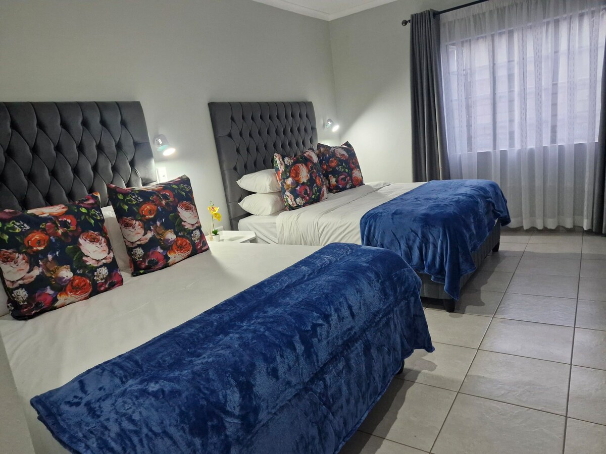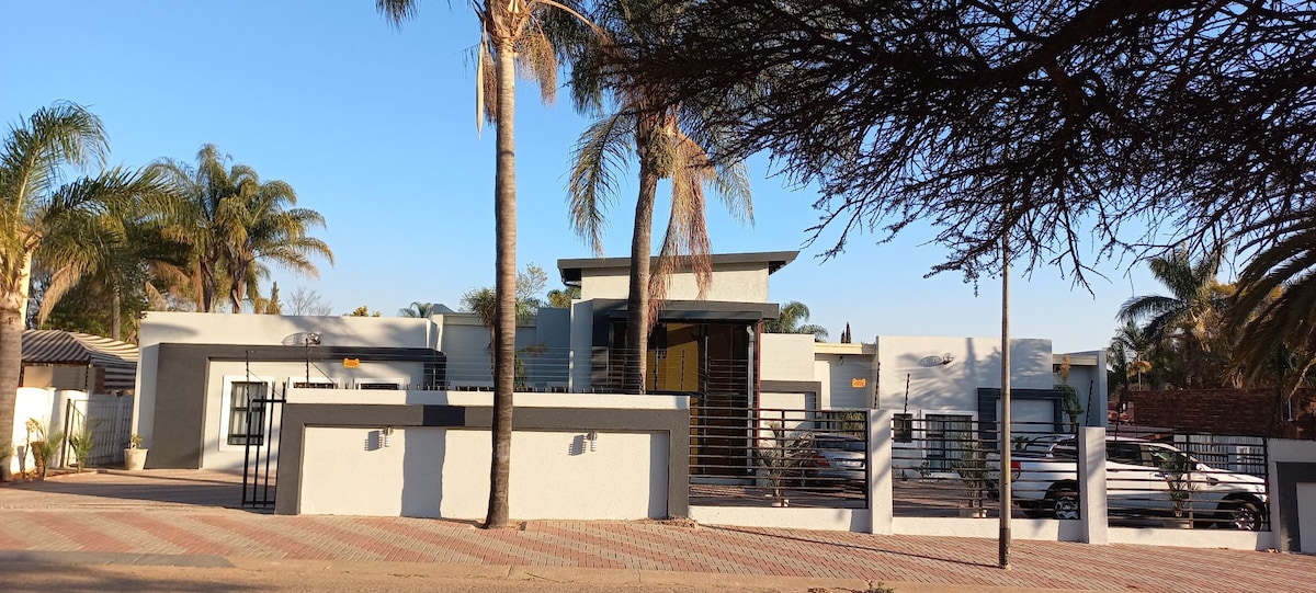 Nice & tranquil. central located in Polokwane cbd. Biztonságos és védett. Sétatávolságra a Peter Mokaba stadiontól, a Greenery bevásárlóközponttól, 5 km-es körzetben a Medi-Clinic, a Netcare Pholoso, a Savanna Mall, a High Court, a Gov Depts, az új egyetemi kórház. Szállj meg nálunk a következő üzleti vagy szabadidős látogatásodhoz a Stars városában. 10 szobánk van, queen méretű ágyakkal. A szobák közül 2-2-2 ággyal rendelkezik. Zuhanyzó, 42 hüvelykes okostévé, DSTV, hűtőszekrény és sötétítőfüggöny. Reggeli extra R150 pp extra