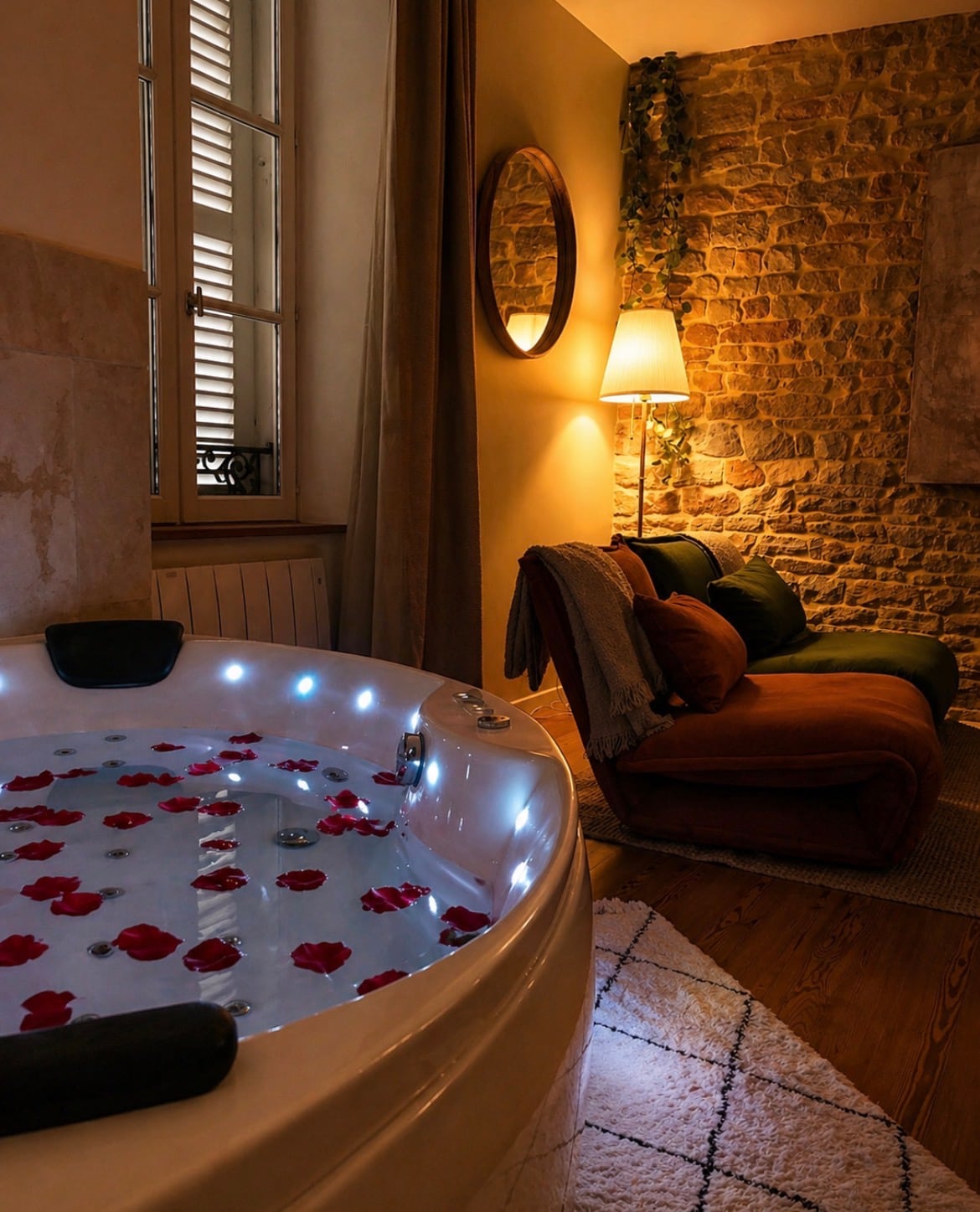 Élvezd a felejthetetlen kiruccanást a teljesen felújított Love Room szobánkban. Úgy terveztük, hogy egyedi és időtlen élményt nyújtson neked. Ez a meghitt és hívogató otthon a legmodernebb mozivászonnal rendelkezik, amely lehetővé teszi, hogy kedvenc filmjeidet és sorozataidat otthonos légkörben élvezd. A balneoterápiás fürdőkád egy pillanatnyi teljes kikapcsolódásra invitál, amely ideális a kikapcsolódáshoz. Egy kőhajításnyira a legjobb éttermektől. Foglalj most, és hagyd, hogy a varázslat működjön!